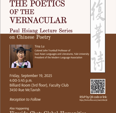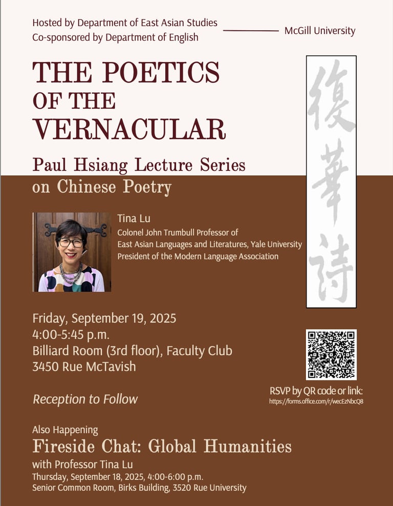 Résumé: Professeure Tina Lu, titulaire de la chaire Colonel John Trumbull de langues et littératures d'Asie de l'Est à l'Université Yale, et présidente de l'Association des langues modernes, sera de passage à l'Université McGill pour présenter la conférence de Paul Hsiang à propos de la poésie Chinoise, intitulée « The Poetics of the Vernacular ». La conférence sera suivie d'un réception.