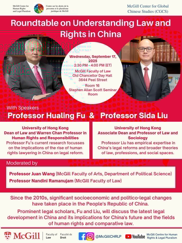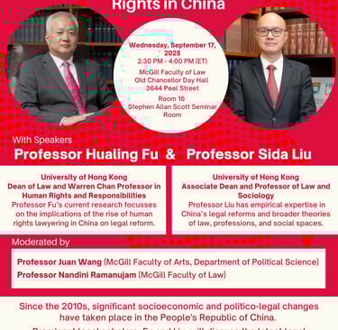 Résumé: Depuis les années 2010, la République populaire de Chine a connu d'importants changements socio-économiques et politico-juridiques. Fu et Liu, éminents juristes, discuteront des dernières évolutions juridiques en Chine et de leurs implications pour l'avenir du pays, ainsi que dans les domaines des droits de l'homme et du droit comparé.