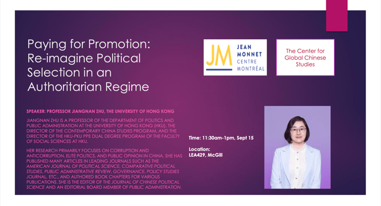 Biographie de l'intervenante : Jiangnan Zhu est professeure au département de sciences politiques et d'administration publique de l'Université de Hong Kong (HKU), directrice du programme d'études sur la Chine contemporaine et directrice du programme de double diplôme HKU-PKU PPE de la faculté des sciences sociales de HKU. Ses recherches portent principalement sur la corruption et la lutte contre la corruption, la politique des élites et l'opinion publique en Chine. Elle a publié de nombreux articles dans des revues de premier plan telles que l'American Journal of Political Science, Comparative Political Studies, Public Administrative Review, Governance, Policy Studies Journal, etc., et a rédigé des chapitres de livres pour diverses publications. Elle est rédactrice en chef du Journal of Chinese Political Science et membre du comité de rédaction de Public Administration.